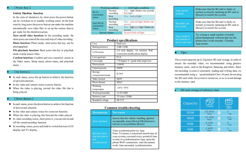 • Mémoire externe: 32 go max (non inclus), carte micro SD de classe 10 (assurez-vous de formater votre carte micro SD avec votre caméra de tableau de bord pour une utilisation optimale. Le non-formatage de la carte microSD peut entraîner une erreur de carte.)