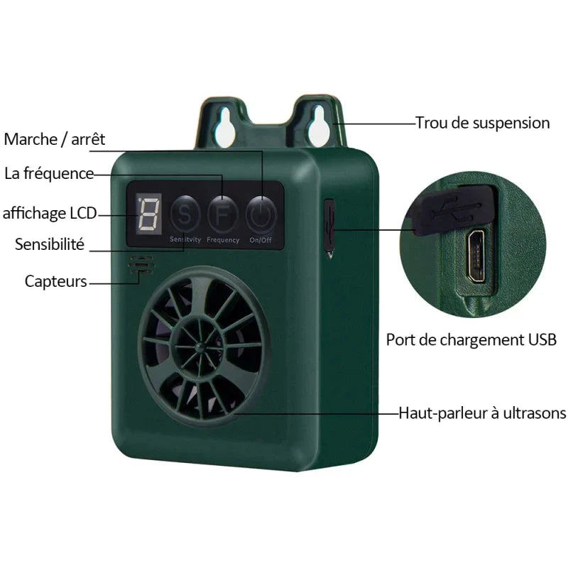 Ce petit appareil anti-aboiement dispose d’un boîtier fabriqué avec de l’ABS de qualité supérieure. Il est résistant, anti-ultraviolet et possède un indice IP45. Avec une conception de petite taille, il s’accroche facilement sur des arbres. Renfermant un capteur très performant avec une sensibilité ajustable, ce système est très efficace pour détecter facilement les aboiements de votre animal.